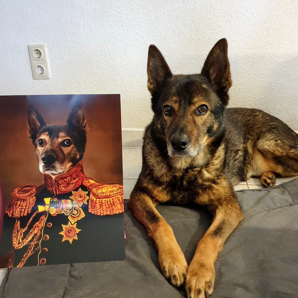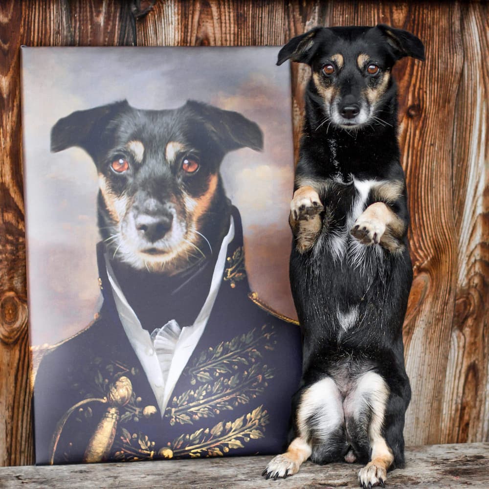 Ein edles Hunde Portrait auf Leinwand von deinem geliebten Vierbeiner. Dabei hast du die Wahl dein Haustier in einen Offizier, eine Königin oder einen anderen Charakter zu verwandeln und ihn anschließend auf einer hochwertigen Leinwand verewigen zu lassen.